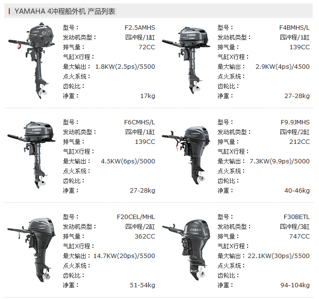 四沖程船外機(jī)系列,具有***的燃料經(jīng)濟(jì)性和清潔排放特性。對(duì)于30PS和更高指標(biāo)的船外機(jī),配有高性能電子燃油噴射,可使性能達(dá)到更高水平。在很多型號(hào)中由于雅馬哈的先進(jìn)技術(shù),還實(shí)現(xiàn)了更高的性能,更輕的質(zhì)量和緊湊式的設(shè)計(jì),可與兩沖程媲美。